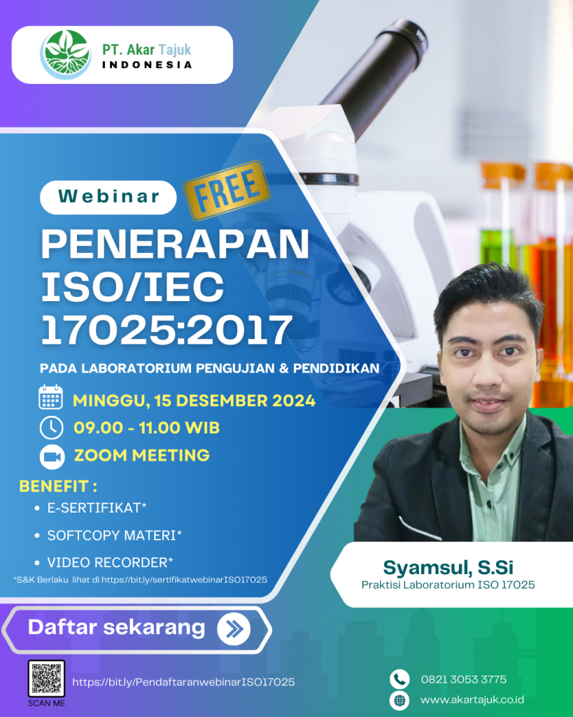 Yuks gabung & ikutan di webinar kami bersama Akar Tajuk Indonesia untuk tau seberapa pentingnya fungsi penerapan ISO 17025:2017 Bagi laboratorium pengujian & pendidikan